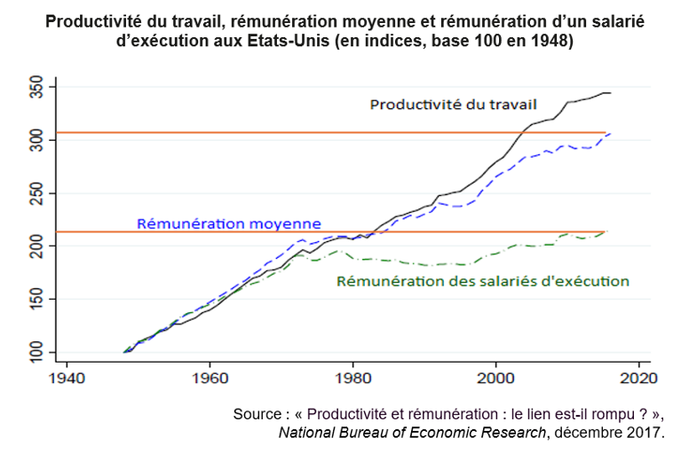 En passant d’un indice base 100 en 1948 à une valeur de 310 environ en 2017, la rémunération moyenne des travailleurs nord-américains a été multipliée par 3,1 sur la période (on pourrait également écrire a augmenté de 210%, mais sans doute est-ce moins parlant). Dans le même temps, en passant d’un indice base 100 en 1948 à 215 en 2017, la rémunération des salariés d’exécution n’a été multipliée « que » par 2,15. On en déduit sur cette période, et surtout depuis le début des années 1980, à un décrochage de la rémunération des salariés d’exécution.